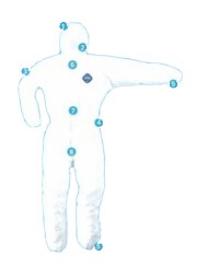 防护服 产品特性 1、防轻度液体飞溅 2、广泛用于石油、木桨、造纸、食品和化学加工、制药行业 1.3片式帽了 2.橡筋面部收口 3.外缝线 4.橡筋腰身 5.橡筋袖口和脚踝口 6.双开式 7.拉链罩 8.附加三角型布料 杜邦™TYVEK®1422A型粉尘防护 采用铝砂粉尘,织物两边压差为1帕(ENITC163 WG3 N263检测方法) 粉尘颗粒大小 粉尘浓度 (个/升) 穿透粉尘量 (pcles.min-1m2per 1000pcles 1-1) 1.0-1.5微米 47042 1 1.5-2.0微米 10384 2 >2.0微米 7054 0