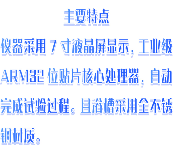 1、仪器采用7寸液晶屏显示,工业级ARM32位贴片处理器,自动完成试验过程。且浴槽采用全不锈钢材质,耐腐蚀。