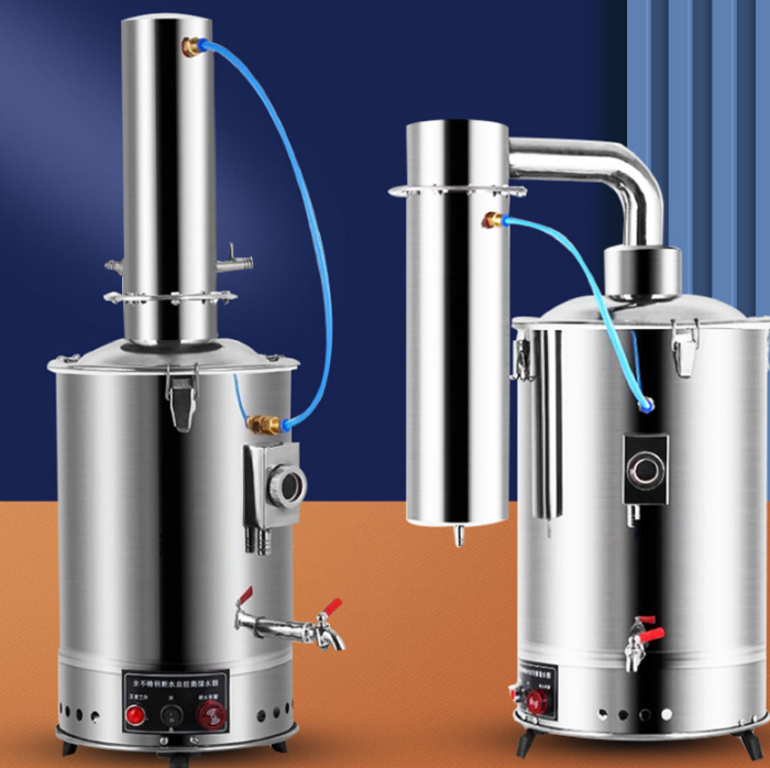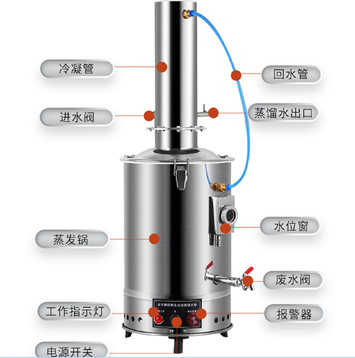 本产品主要由不锈钢蒸发锅、冷凝器、电气装置三部分组成。本产品的零部件用不锈钢薄板,经过滚压,延伸与焊接加工而成,锅内水位大于限定位置能自动溢*出、锅身与锅盖有气密装置。设有挡帽,能地防*止蒸气挟带水滴而影响蒸馏水质。锅内水垢可用酸、液碱洗刷,便于洗刷内部水垢。本部件加热部分由浸*入式电热管组成,电热管为T4紫铜护套,表面镀以纯锡,耐用;安装在蒸发锅内部底,使用时切勿断水!