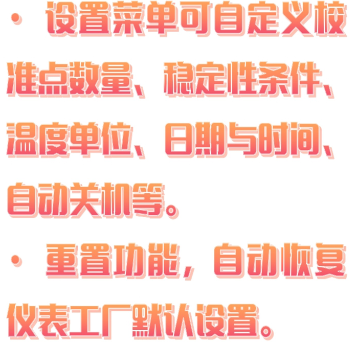 •设置菜单可自定义校准点数量、性条件、温度单位、日期与时间、自动关机等。