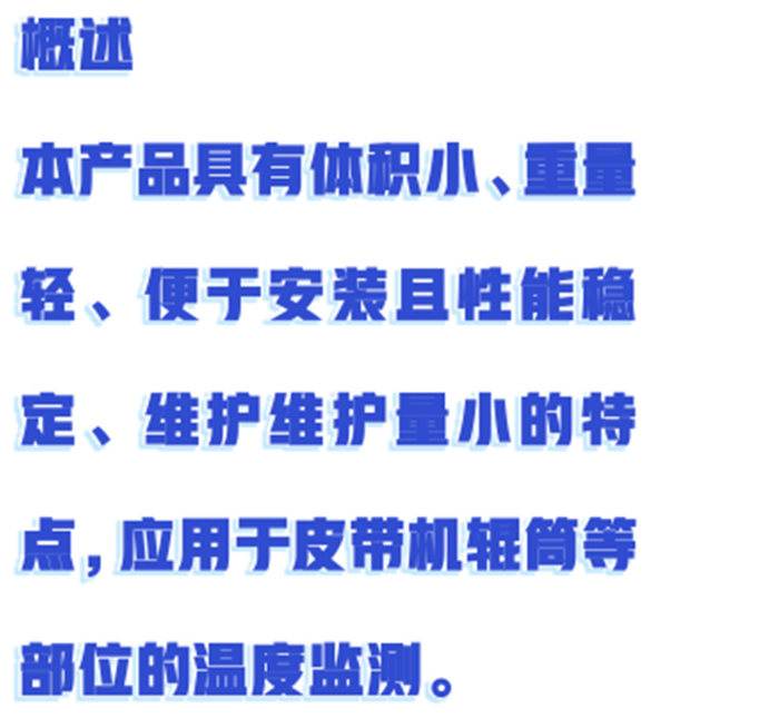 本产品具有体积小、重量轻、便于安装且性能、维护维护量小的特点,应用于皮带机辊筒等部位的温度监测。